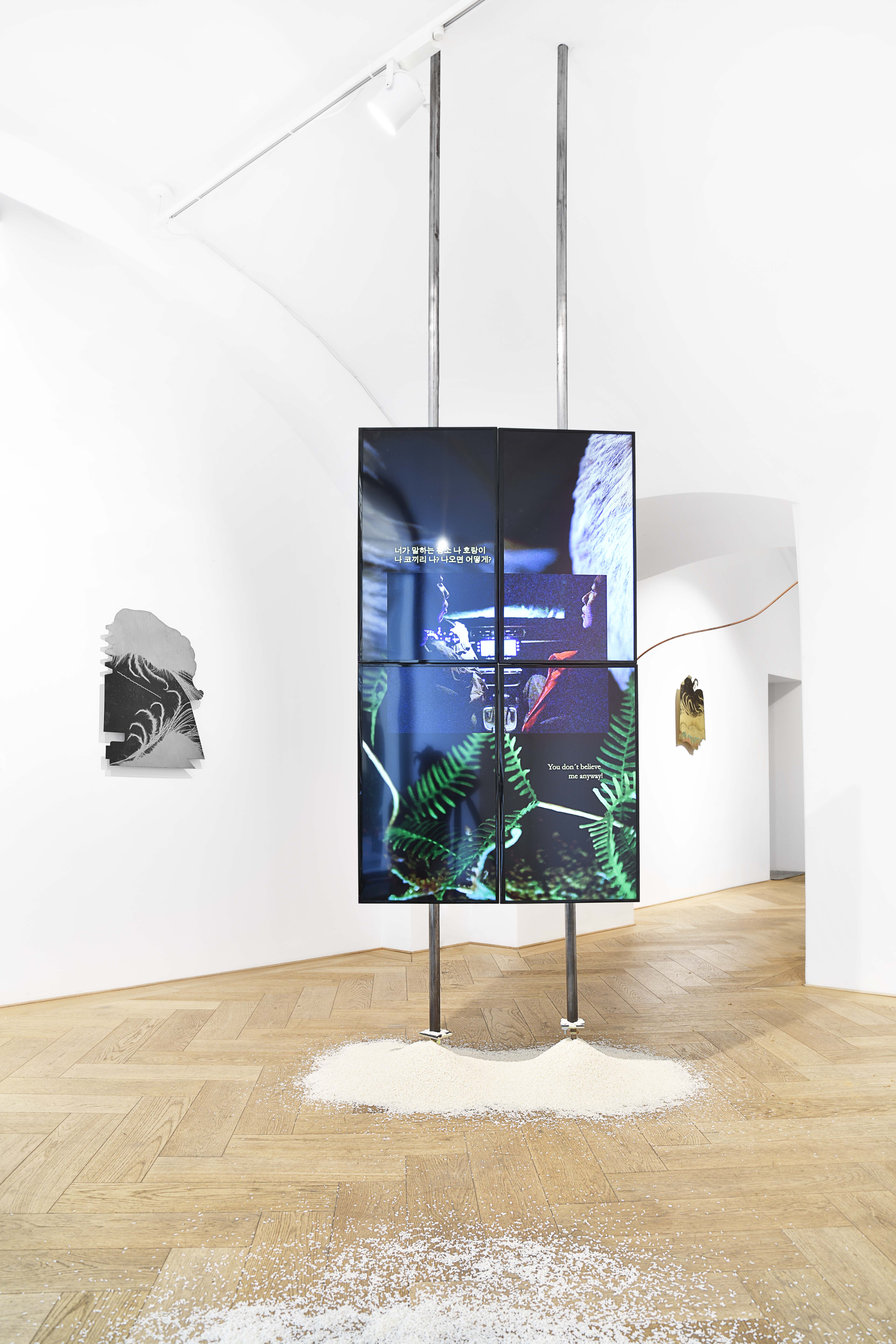 This concern manifests itself particularly clearly in the four-channel video installation Long Durée in the middle of the room. Several screens are mounted on steel tubes, a story unfolds: a young couple is driving at night in a car, a heated argument breaks out. The reason for the dispute is the protagonist’s claim that she has seen a strange creature in the forest. When the situation escalates, the woman gets out of the car and decides to go in search of the creature. The path leads over an embankment, the protagonist loses her footing and slips, in free fall she changes age, appearance, gender and ethnicity. Behind the foliage and trees, the silhouette of the being she is looking for – the Bulgasari – is hinted at again and again. Finally, she is back in her partner’s car and the story returns to the starting point and begins again.” (read more below)