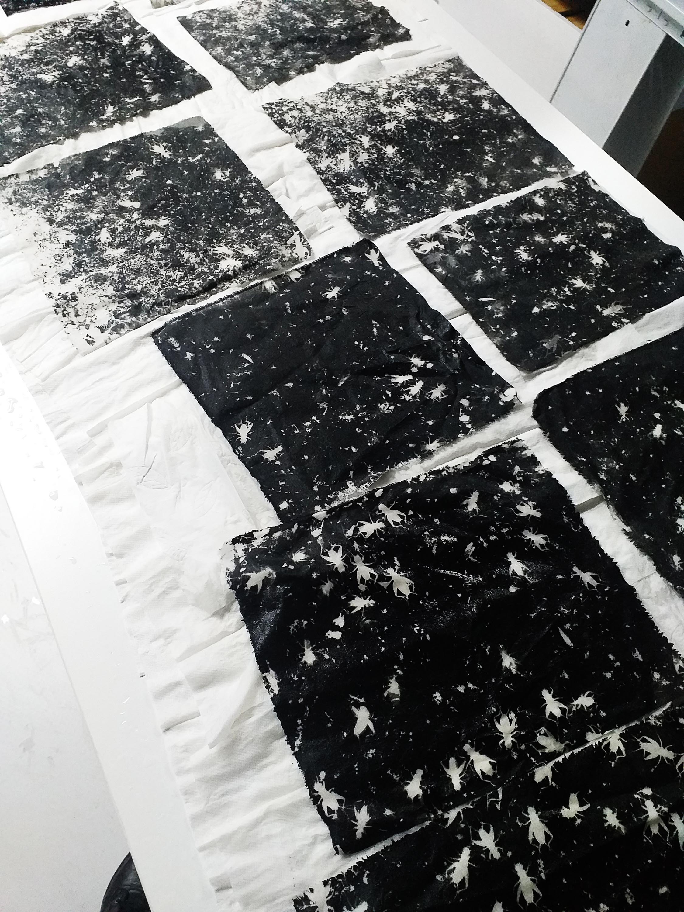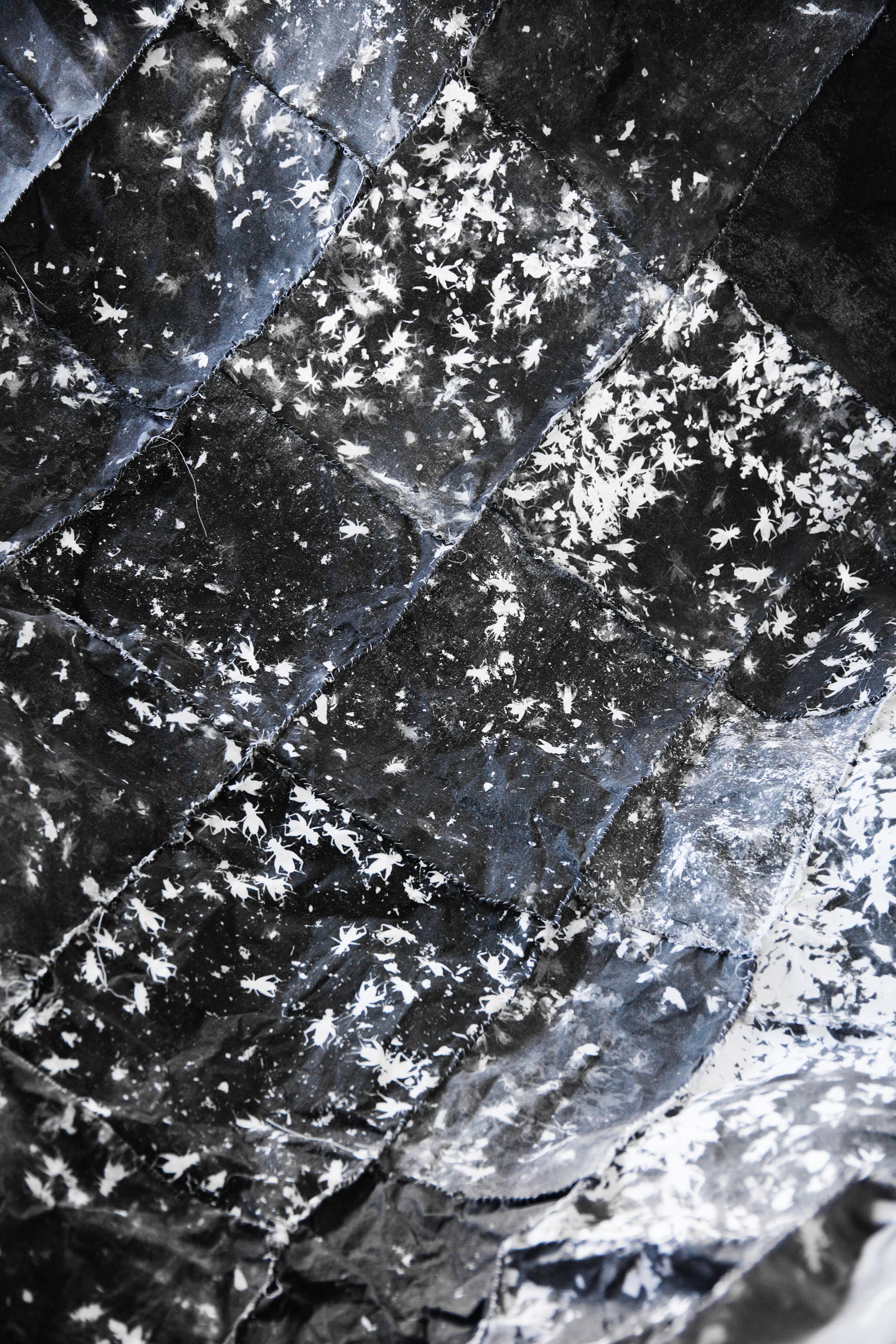 A moving corpus floats in the room. It contiguously moves and stretches due to four engines. The behavior pattern is inspired by cricket swarms and has a programmed algorithm that alternates in resting and moving phases. It´s single pieces consist of analogue photoprints on wool- they depict the resting and running phases of cricket swarms. By putting them through different light- and temperature- conditions I was able to capture different patterns of their movement without fully being able to control them. I mirrored their unpredictable tactile behaviour and sounds by installing servo engines on an aluminium frame. The program switches between resting and pulling motions, creating a random and anonymous being.